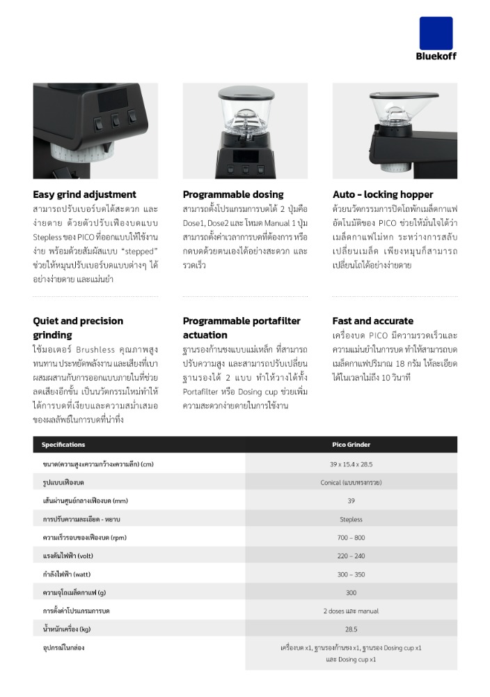 เครื่องบด Pico มีความรวดเร็วและความแม่นยำในการบด ทำให้สามารถบดเมล็ดกาแฟปริมาณ 18 กรัม ให้ละเอียดได้ในเวลาไม่ถึง 10 วินาที