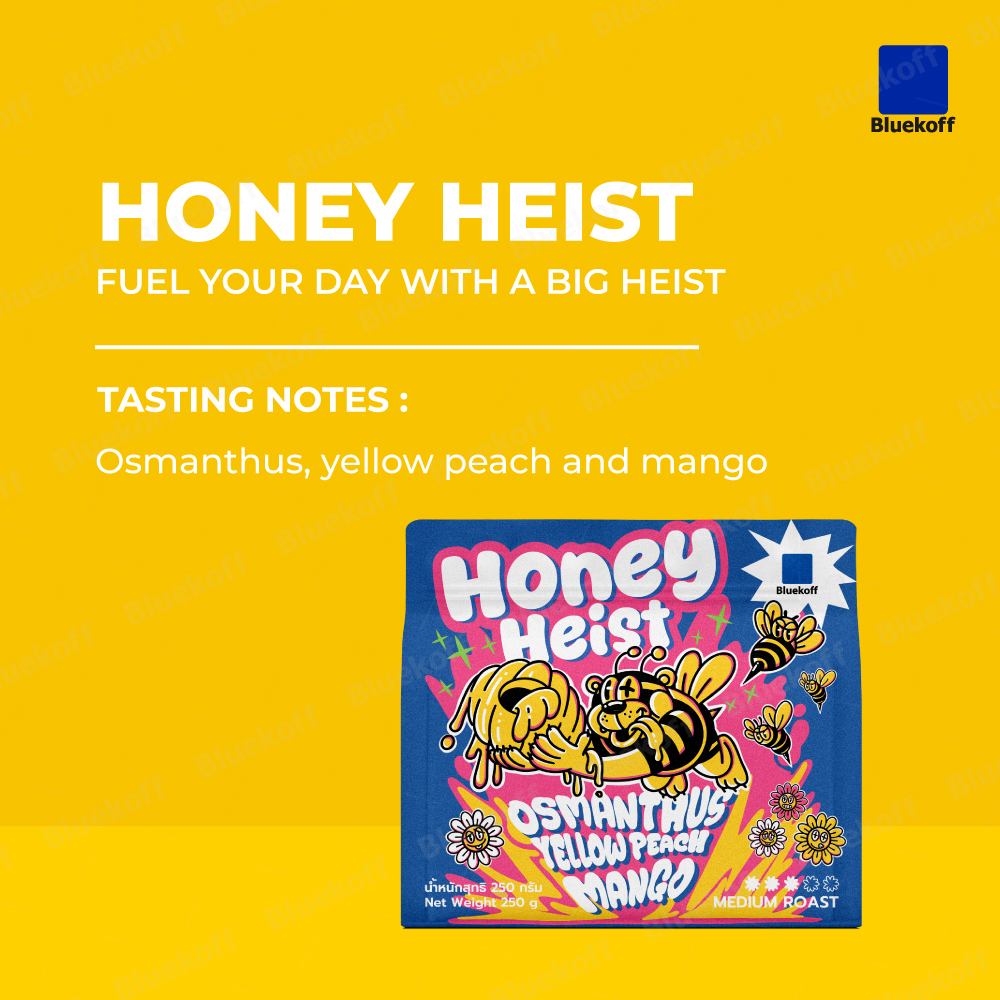 พร้อมจะทำภารกิจปล้นโมเมนต์สุดพิเศษของเช้าวันนี้หรือยัง? Honey Heist ไม่ใช่แค่กาแฟธรรมดา แต่มันคือการพักเบรกไปสู่โลกของความสนุก ด้วยรสชาติที่โดดเด่นของน้ำผึ้งและกลิ่นหอมดอกหอมหมื่นลี้ (Osmanthus) ที่ถูกเบลนด์มาอย่างดี ผสานด้วยรสเปรี้ยวอมหวานของพีชสีเหลืองและมะม่วงสุกที่หอมหวาน นำเสนอรสชาติโทนผลไม้สีเหลืองสุกฉ่ำได้เป็นอย่างดี ไม่ว่าคุณจะเริ่มวันใหม่หรือพักเบรกจากโลกที่รวดเร็ว เราตั้งใจให้กาแฟแก้วนี้เป็นอาวุธลับแห่งความสนุกของคุณ มาร่วมภารกิจกับเหล่าหมีจอมโจร แล้วปลุกพลังวันใหม่ด้วยการปล้นความอร่อยที่หอมหวานและสดใสไปกับรสชาติให้กลายเป็นกาแฟแก้วโปรดของคุณ