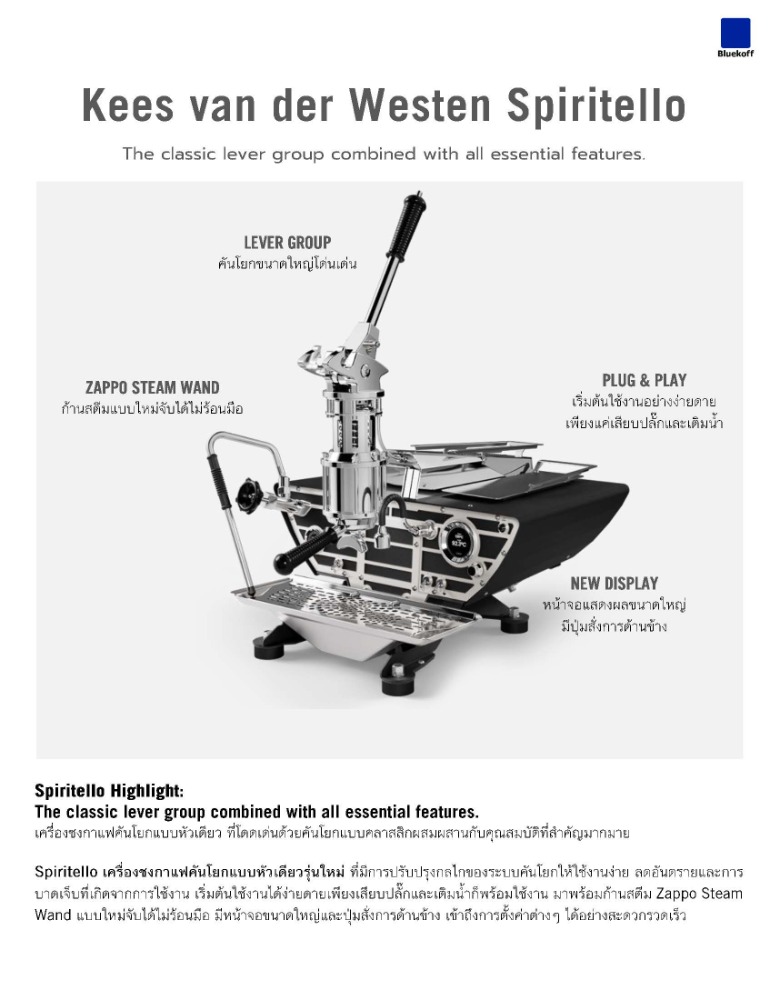 Spiritello เครื่องชงกาแฟคันโยกรุ่นใหม่ ที่มีการปรับปรุงกลไกของระบบคันโยกให้ใช้งานง่าย ลดอันตรายและการบาดเจ็บที่เกิดจากการใช้งาน เริ่มต้นใช้งานได้ง่ายดายเพียงเสียบปลั๊กและเติมน้ำก็พร้อมใช้งาน มาพร้อมก้านสตีม Zappo Steam Wand แบบใหม่จับได้ไม่ร้อนมือ มีหน้าจอขนาดใหญ่และปุ่มสั่งการด้านข้าง เข้าถึงการตั้งค่าต่างๆ ได้อย่างสะดวกรวดเร็ว