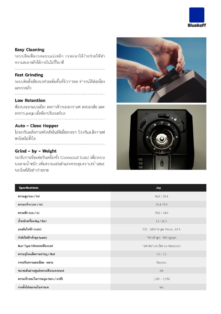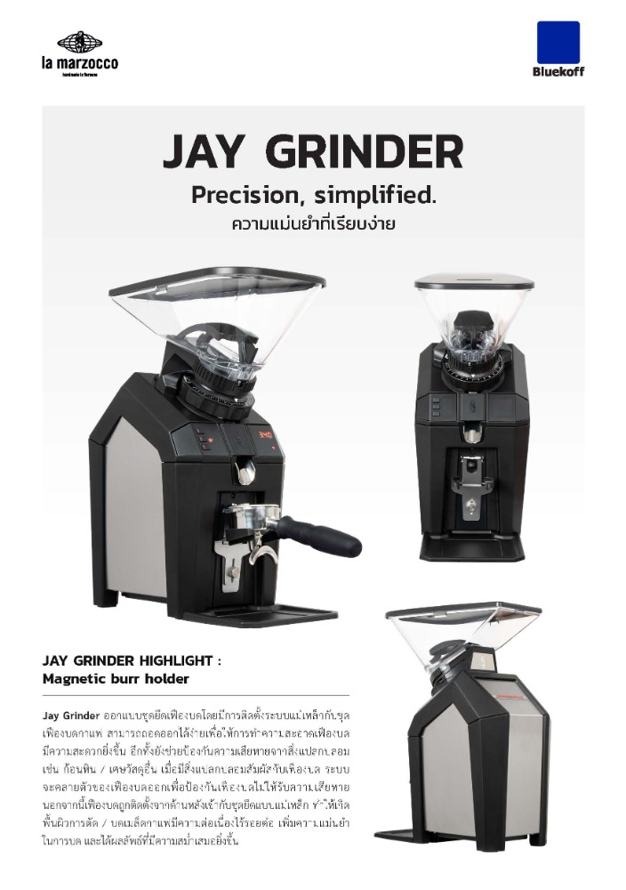 Jay Grinder ถูกออกแบบภายใต้แนวคิด “ความแม่นยำที่เรียบง่าย” เพื่อยกระดับมาตรฐานการบดกาแฟในทุกการใช้งาน ตัวเครื่องมาพร้อมดีไซน์เฉพาะที่ใช้ระบบยึดเฟืองบดแบบแม่เหล็ก (Magnetic Burr Holder) ช่วยเพิ่มพื้นที่ผิวการตัด ทำให้การบดรวดเร็ว สม่ำเสมอ และถอดทำความสะอาดได้ง่ายและสะดวกสบาย เสริมประสิทธิภาพด้วยระบบจัดศูนย์เฟืองบดที่จดสิทธิบัตร เพื่อความเที่ยงตรงสูงสุดในการกระจายผงกาแฟ พร้อมหน้าจอควบคุมที่ใช้งานง่าย สามารถตั้งค่าและโปรแกรมได้อย่างแม่นยำ รวมถึงระบบ Smart Connectivity ที่รองรับการบดตามน้ำหนัก (Grind-by-Weight) เพื่อให้ได้ปริมาณที่ถูกต้องในทุกช็อต Jay Grinder จึงเป็นตัวเลือกที่เหมาะสำหรับร้านกาแฟและมืออาชีพที่ต้องการความสม่ำเสมอ คุณภาพ และประสิทธิภาพในระดับสูงสุดในทุกแก้ว