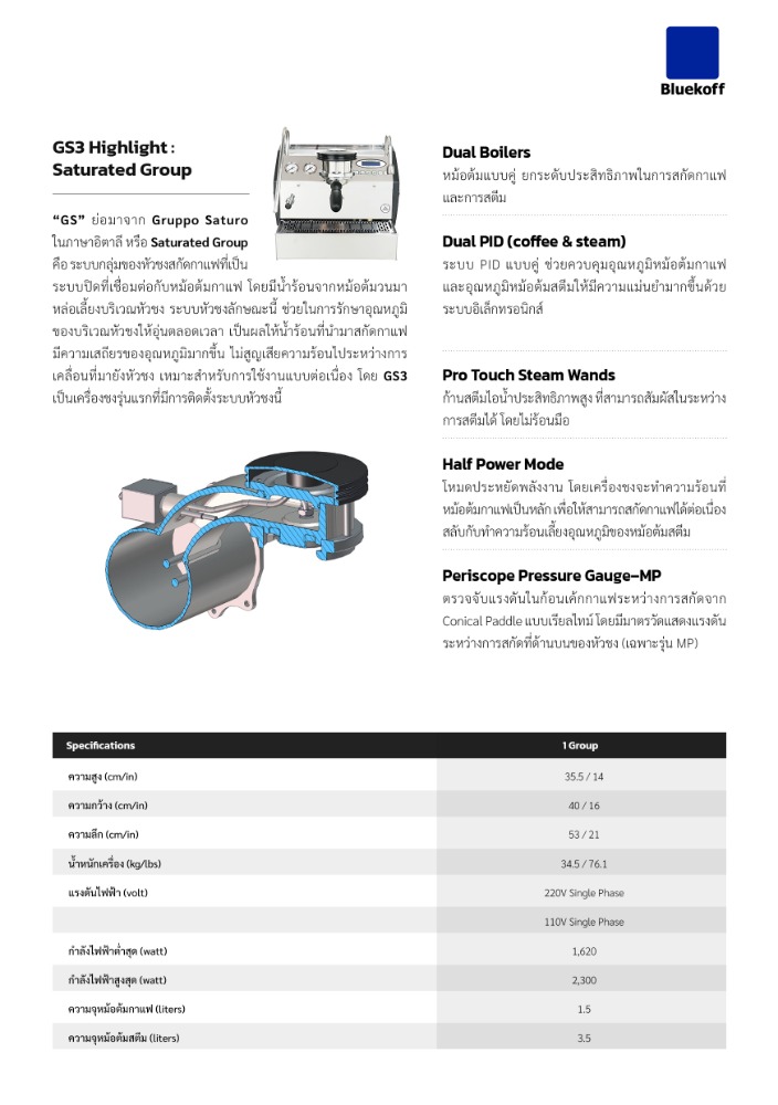 “GS” ย่อมาจาก Gruppo Saturo ในภาษาอิตาลี หรือ Saturated Group คือ ระบบกลุ่มของหัวชงสกัดกาแฟที่เป็นระบบปิดที่เชื่อมต่อกับหม้อต้มกาแฟ โดยมีน้ำร้อนจากหม้อต้มวนมาหล่อเลี้ยงบริเวณหัวชง ระบบหัวชงลักษณะนี้ ช่วยในการรักษาอุณหภูมิของบริเวณหัวชงให้อุ่นตลอดเวลา เป็นผลให้น้ำร้อนที่นำมาสกัดกาแฟมีความเสถียรของอุณหภูมิมากขึ้น ไม่สูญเสียความร้อนไประหว่างการเคลื่อนที่มายังหัวชง เหมาะสำหรับการใช้งานแบบต่อเนื่อง โดย GS3 เป็นเครื่องชงรุ่นแรกที่มีการติดตั้งระบบหัวชงนี้