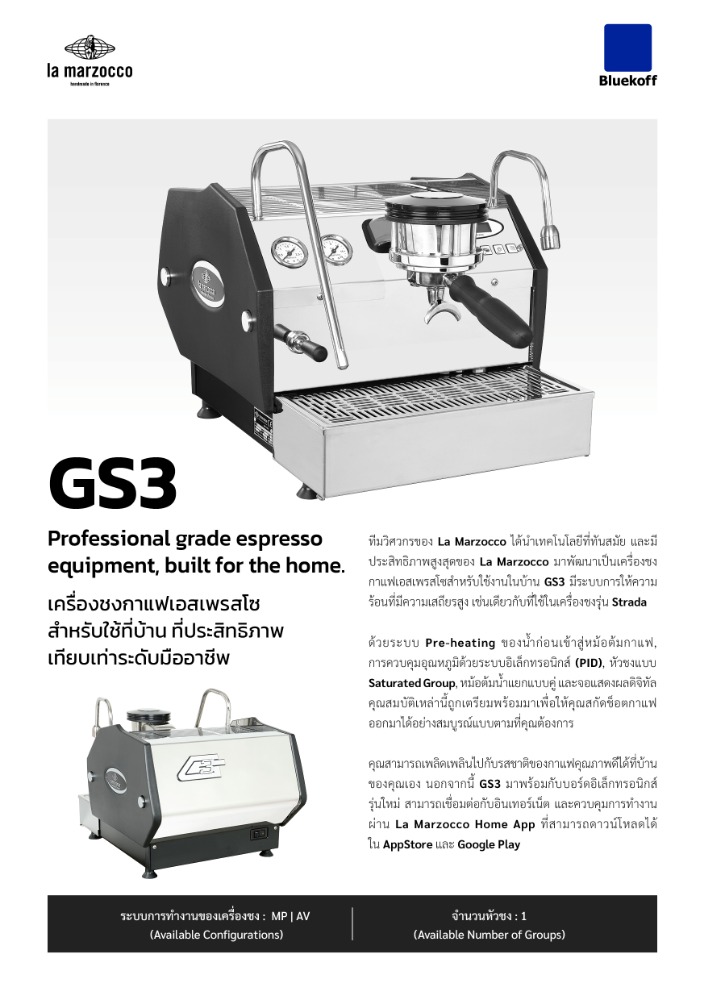 ทีมวิศวกรของ La Marzocco ได้นำเทคโนโลยีที่ทันสมัยและมีประสิทธิภาพสูงสุดของ La Marzocco มาพัฒนาเป็นเครื่องชงกาแฟเอสเพรสโซสำหรับร้านกาแฟ GS3 มีระบบการให้ความร้อนที่มีความเสถียรสูง เช่นเดียวกับที่ใช้ในเครื่องชงรุ่น Strada ด้วยระบบ Pre-heating ของน้ำก่อนเข้าสู่หม้อต้มกาแฟ, การควบคุมอุณหภูมิด้วยระบบอิเล็กทรอนิกส์ (PID), หัวชงแบบ Saturated Group, หม้อต้มน้ำแยกแบบคู่และจอแสดงผลดิจิตอล คุณสมบัติเหล่านี้ถูกเตรียมพร้อมมาเพื่อให้คุณสกัดช็อตกาแฟออกมาได้อย่างสมบูรณ์แบบตามที่คุณต้องการ คุณสามารถเพลิดเพลินไปกับรสชาติของกาแฟคุณภาพดีได้ นอกจากนี้ GS3 มาพร้อมกับบอร์ดอิเล็กทรอนิกส์รุ่นใหม่ สามารถเชื่อมต่อกับอินเทอร์เน็ต และควบคุมการทำงานผ่าน La Marzocco ที่สามารถดาวน์โหลดได้ ใน AppStore และ Google Play