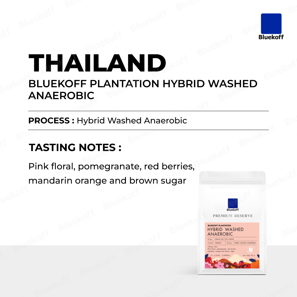 Bluekoff Hybrid Anaerobic เป็นโปรเซสที่บลูคอฟพัฒนามาจาก Anaerobic Process ปี 2020 ที่ได้รับรางวัลชนะเลิศสุดยอดเมล็ดกาแฟพิเศษไทย Natural Process ซึ่งเป็นการนำเอาเทคนิคการหมักแบบไม่ใช้ออกซิเจนมาประยุกต์ใช้กับการโปรเซสเมล็ดกาแฟไทยตามรูปแบบของบลูคอฟ เพื่อต้องการพัฒนารสชาติของกาแฟไทยให้โดดเด่นขึ้น แต่ยังคงไว้ซึ่งกลิ่นที่สะอาด ไม่มีกลิ่นจากการหมักที่มากเกินไปและควบคุมคุณภาพให้มีความสม่ำเสมอ ผลลัพธ์ที่ได้ คือ กาแฟมีรสหวานขึ้น มีรสเปรี้ยวอมหวานของผลไม้ มีความสะอาด มีเนื้อสัมผัสที่ดีและกลิ่นตอนท้ายหอมค้างยาวนาน สามารถดื่มได้ทุกวันไม่เบื่อเลย เพราะ...“บลูคอฟอยากเห็นคนไทย ดื่มกาแฟไทยที่ดีในทุกๆ วัน”