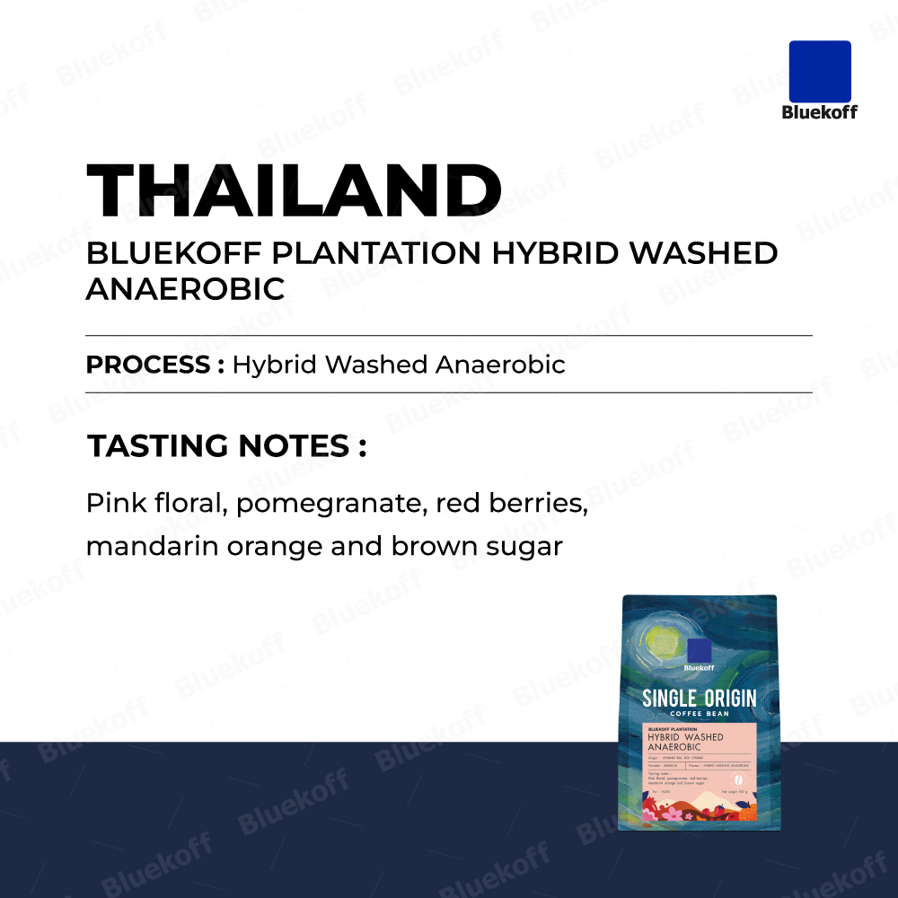 Bluekoff Hybrid Anaerobic เป็นโปรเซสที่บลูคอฟพัฒนามาจาก Anaerobic Process ปี 2020 ที่ได้รับรางวัลชนะเลิศสุดยอดเมล็ดกาแฟพิเศษไทย Natural Process ซึ่งเป็นการนำเอาเทคนิคการหมักแบบไม่ใช้ออกซิเจนมาประยุกต์ใช้กับการโปรเซสเมล็ดกาแฟไทยตามรูปแบบของบลูคอฟ เพื่อต้องการพัฒนารสชาติของกาแฟไทยให้โดดเด่นขึ้น แต่ยังคงไว้ซึ่งกลิ่นที่สะอาด ไม่มีกลิ่นจากการหมักที่มากเกินไปและควบคุมคุณภาพให้มีความสม่ำเสมอ ผลลัพธ์ที่ได้ คือ กาแฟมีรสหวานขึ้น มีรสเปรี้ยวอมหวานของผลไม้ มีความสะอาด มีเนื้อสัมผัสที่ดีและกลิ่นตอนท้ายหอมค้างยาวนาน สามารถดื่มได้ทุกวันไม่เบื่อเลย เพราะ...“บลูคอฟอยากเห็นคนไทย ดื่มกาแฟไทยที่ดีในทุกๆ วัน”