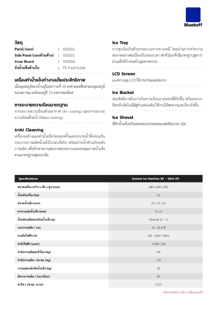 - รูปแบบน้ำแข็ง : Cube ก้อนสี่เหลี่ยม