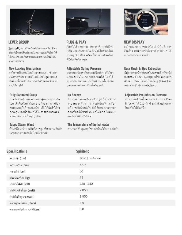 Spiritello เครื่องชงกาแฟคันโยกรุ่นใหม่ ที่มีการปรับปรุงกลไกของระบบคันโยกให้ใช้งานง่าย ลดอันตรายและการบาดเจ็บที่เกิดจากการใช้งาน เริ่มต้นใช้งานได้ง่ายดายเพียงเสียบปลั๊กและเติมน้ำก็พร้อมใช้งาน มาพร้อมก้านสตีม Zappo Steam Wand แบบใหม่จับได้ไม่ร้อนมือ มีหน้าจอขนาดใหญ่และปุ่มสั่งการด้านข้าง เข้าถึงการตั้งค่าต่างๆ ได้อย่างสะดวกรวดเร็ว